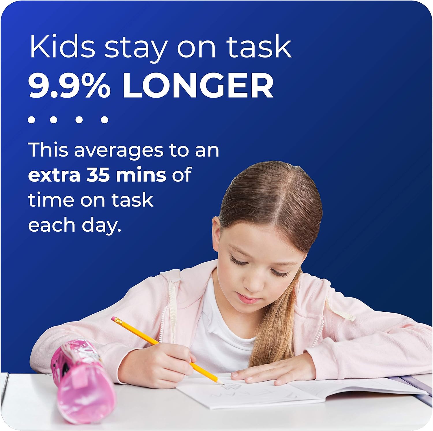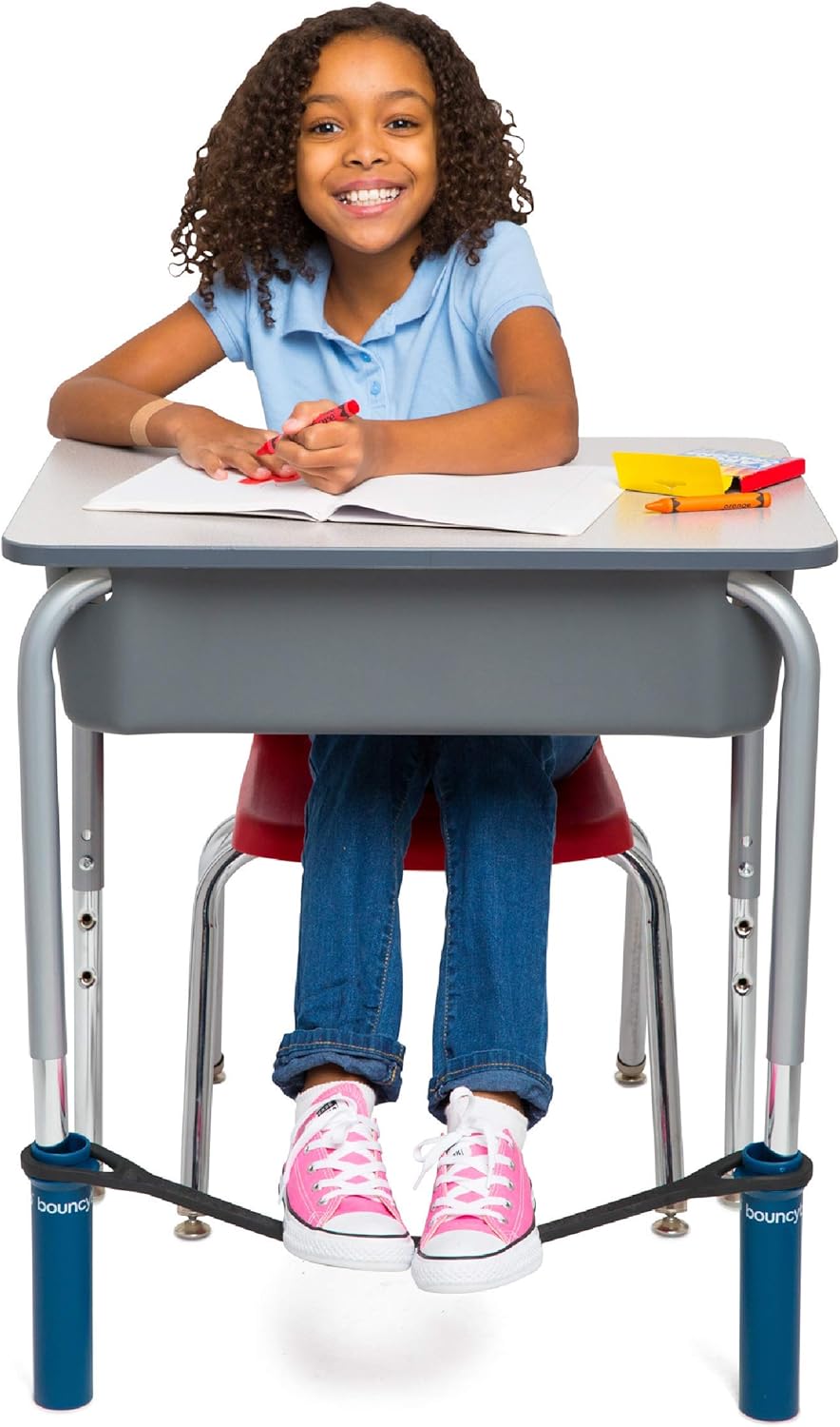 Bouncy bands help promote active learning in children by allowing them to stretch their legs, bounce their feet, and prop up their feet instead of having them dangle all. The patented support pipes on the bouncyband prevent it from slipping down the desk legs onto the floor, becoming a nuisance like all competitive products. The original bouncyband for desks increases focus and academic performance by giving students an outlet for excess energy while working.